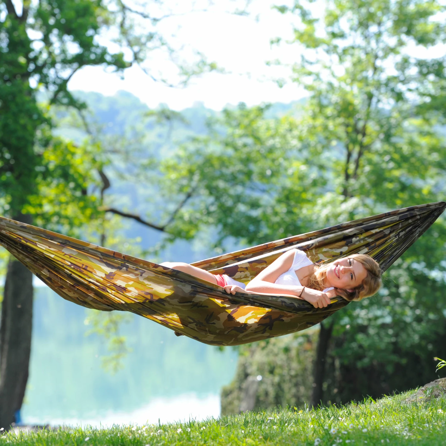 De extra grote lichtgewicht hangmat met geïntegreerd touw en haak. Wikkel het touw gewoon een paar keer rond een boom aan elke kant en maak het vast met de haak. Klaar! Extra stevig, ademend en huidvriendelijk polyester.