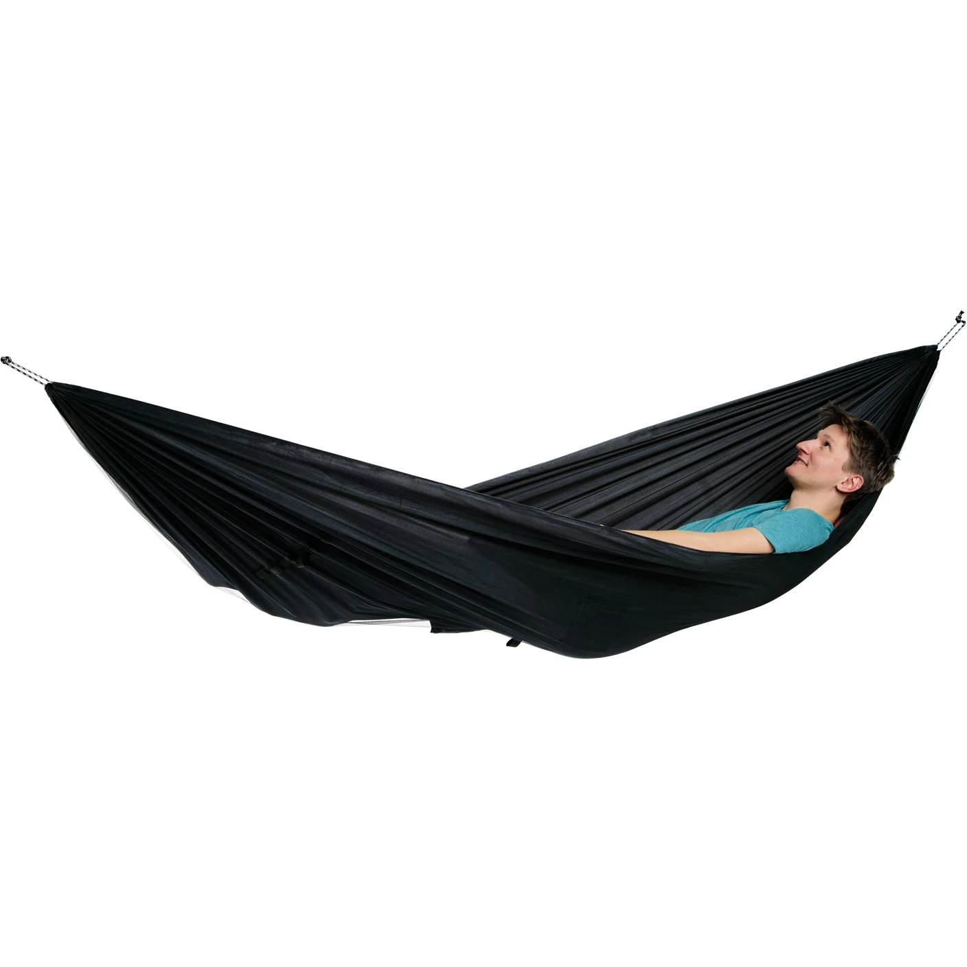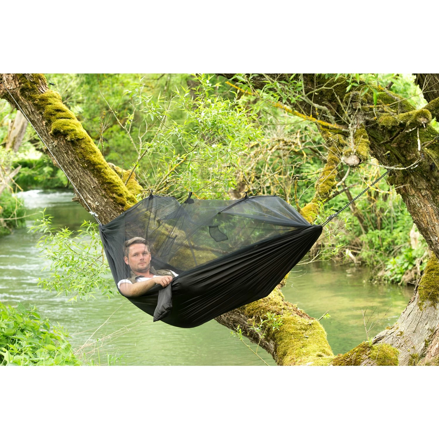 De Moskito-Traveller Extreme hangmat beschermt je permanent tegen vliegende insecten zoals muggen en knutten, maar ook tegen kruipende insecten zoals teken, mieren en kakkerlakken. Bovendien zijn zowel het ligvlak als het muskietennet geïmpregneerd. De impregnatie van stof en net is volledig onschadelijk voor mensen, huidvriendelijk, geurloos, hittebestendig en wasbaar (tot max. 50 wasbeurten). De ingang is via een rits aan de zijkant.