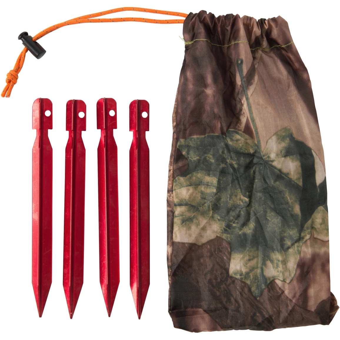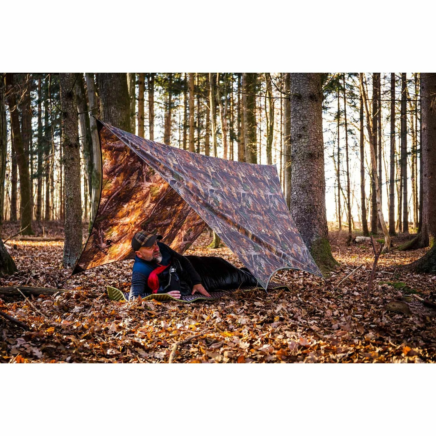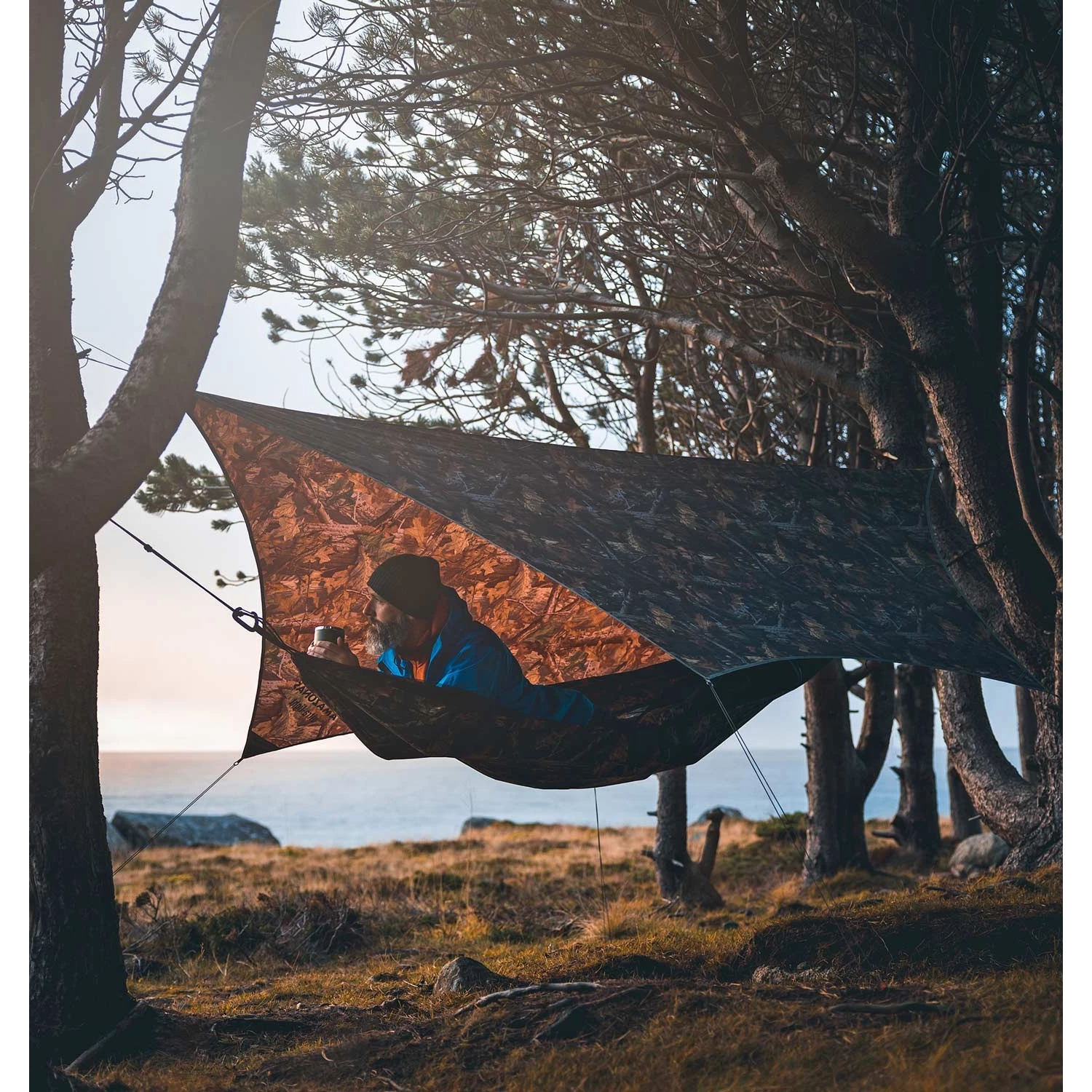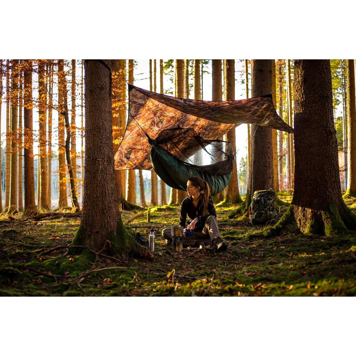 Het zeil is precies aangepast aan de ultralichte afmetingen van de hangmat. Dit verandert de hangmat in een buitenbed. De tarp wordt opgehangen aan de bevestigingspunten van de hangmat en geschoord. De trapeziumvormige snit van de tarp laat voldoende lucht circuleren en beschermt toch tegen regen, zon en vallende bladeren. Alle afspanpunten zijn voorzien van kleine zakjes voor de lijnen. Voor optimale camouflage in bijna alle seizoenen: De boslook combineert een patroon van bladeren, bomen en de typische kleuren van het bos. De tarp gaat zo onopvallend op in de achtergrond en optische silhouetten vervagen.