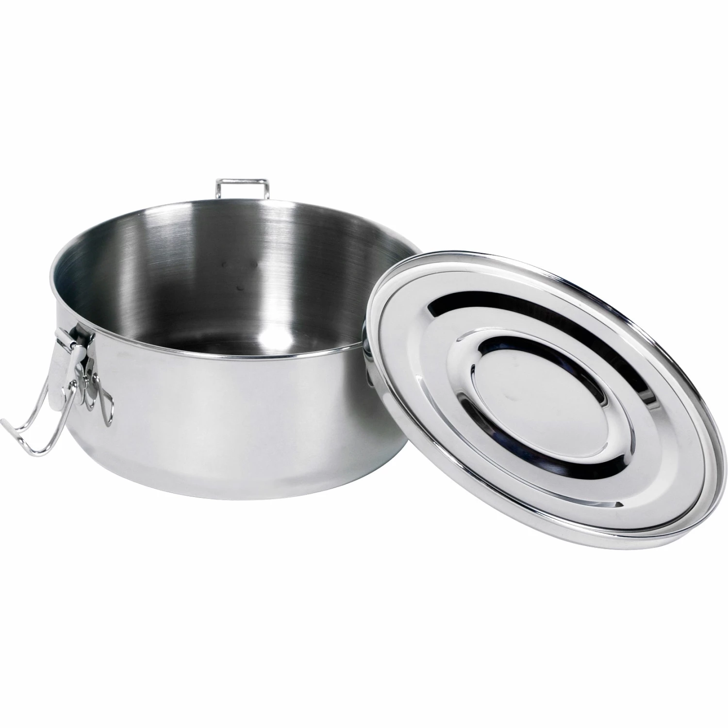 De roestvrijstalen heeft een deksel dat sluit met 3 grendels en een afdichting die de inhoud beschermt tegen opspattend water. Hij is ideaal voor snacks, voorgekookte maaltijden, opslag, kampeerkeuken of buitenevenementen. Maar ook thuis en op tuinfeestjes slaat hij een goed figuur.
