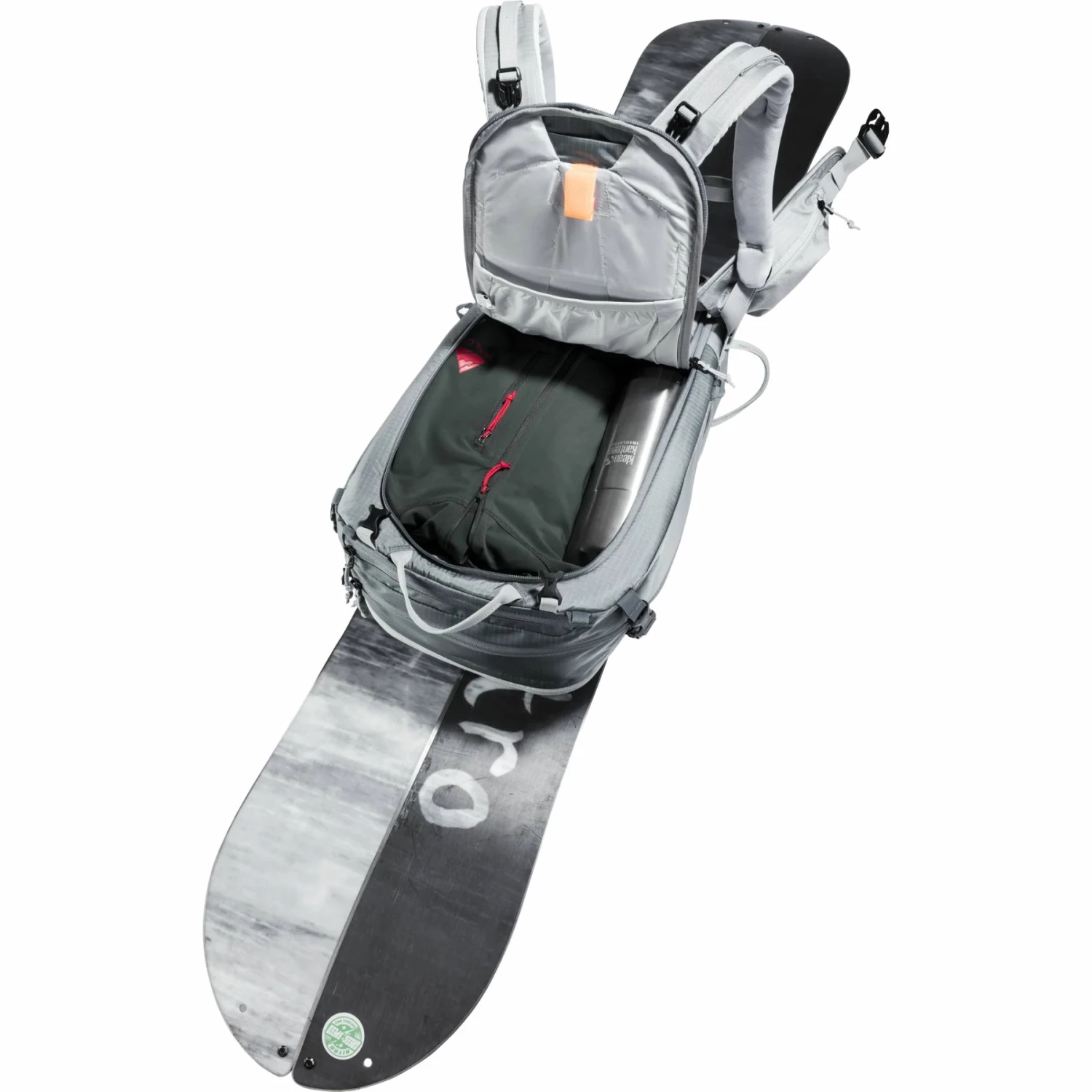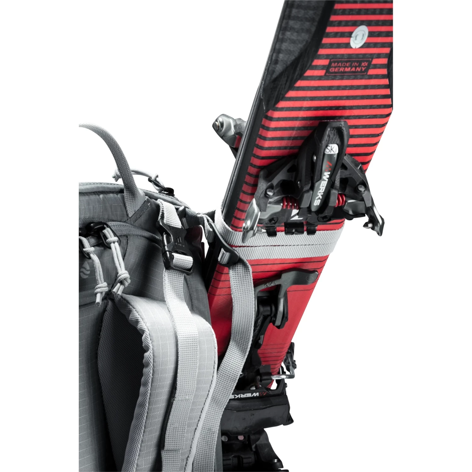 Met twee aparte riemen kunnen ski’s, snowboard en sneeuwschoenen in een handomdraai aan de buitenkant van de rugzak worden bevestigd: Ski’s diagonaal of in A-vorm, snowboard en sneeuwschoenen verticaal. Bovendien dienen de flexibel bruikbare bevestigingsriemen voor zijdelingse compressie.