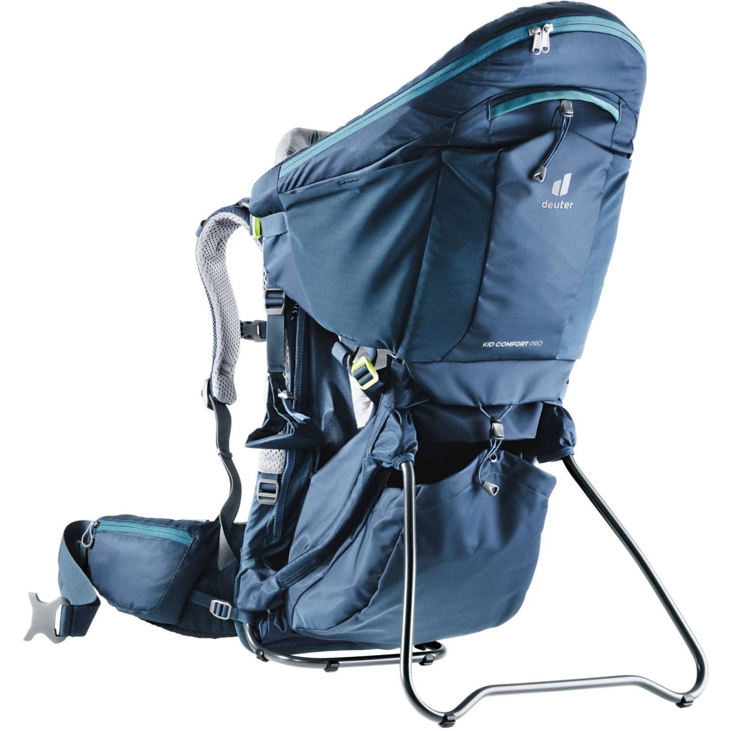 De professionele kinderdrager scoort met een geïntegreerde, afzonderlijk bruikbare dagrugzak voor snel gebruik aan de luiertafel, de vast geïnstalleerde zonnekap en een spiegel voor een snelle blik op de passagier achterin.