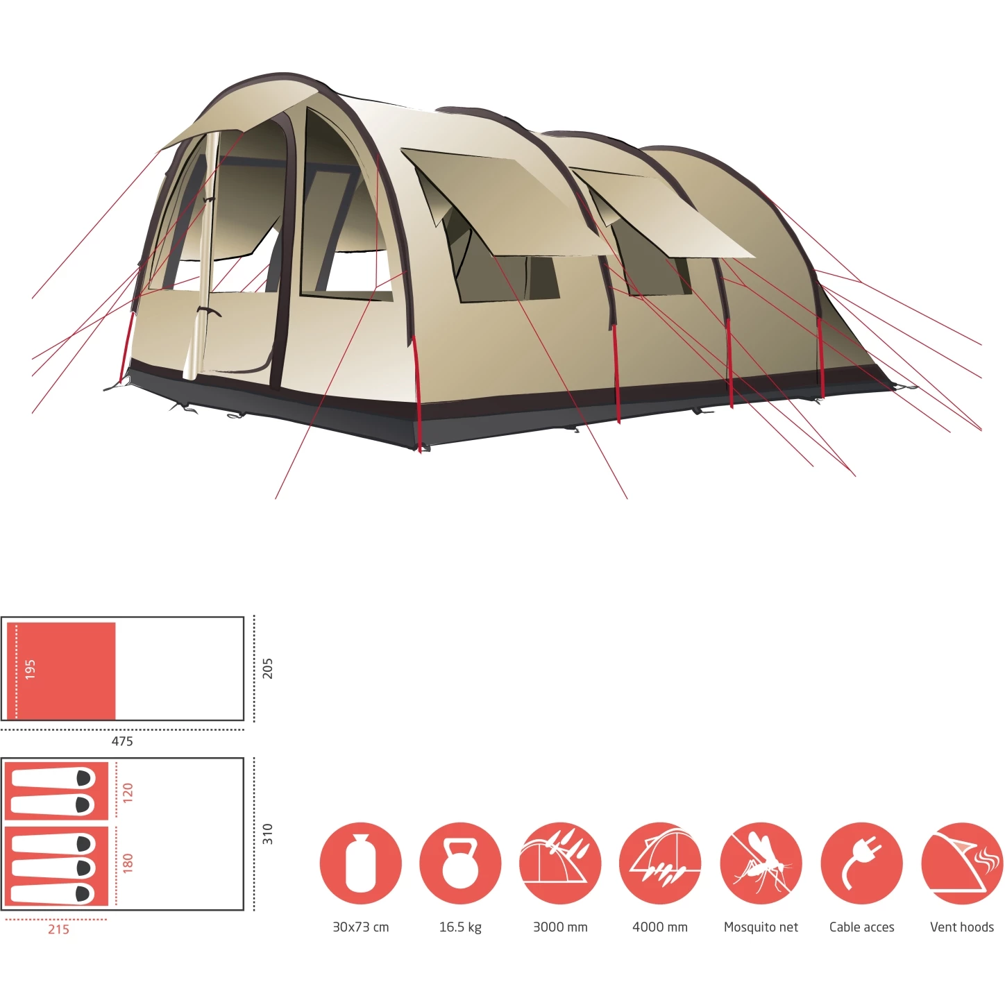 HELENA 5 is een tunneltent voor gezinnen en groepen met een uitstekend ruimtegevoel en twee aparte slaapgedeelten – één voor drie personen en de andere voor twee personen of bagage en spullen. De grote vestibule is overal meer dan 2 meter hoog en biedt ruimte om overdag of tijdens het diner comfortabel bij elkaar te zitten. Grote overdekte ventilatieopeningen en ramen met horren op de buitentent zorgen voor een comfortabele luchtcirculatie en een goed binnenklimaat in de tent.