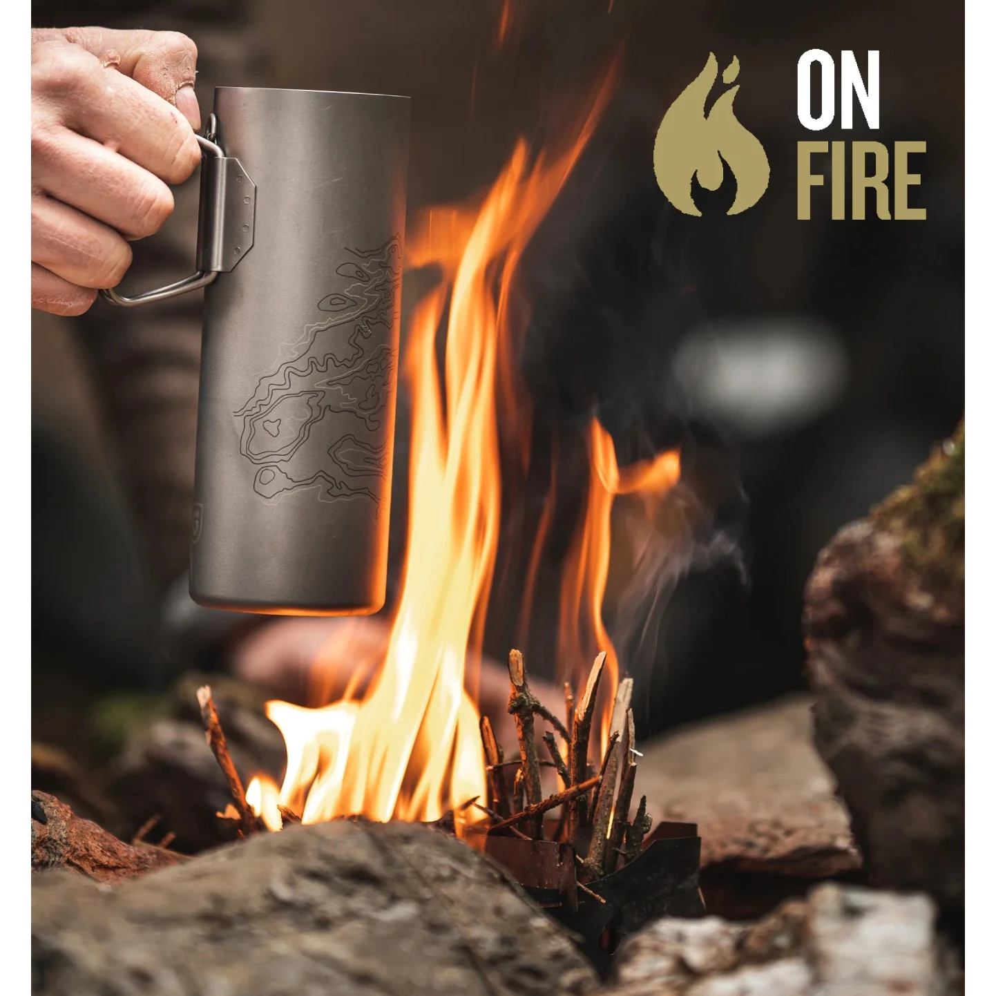 - Verwarm het! Met behulp van de vlindergrepen kan de Outer Ti Cup worden gebruikt om water te verwarmen en eten te koken naast hete kolen of bij een direct vuur en ook met de Grayl Titanium camping cooker.