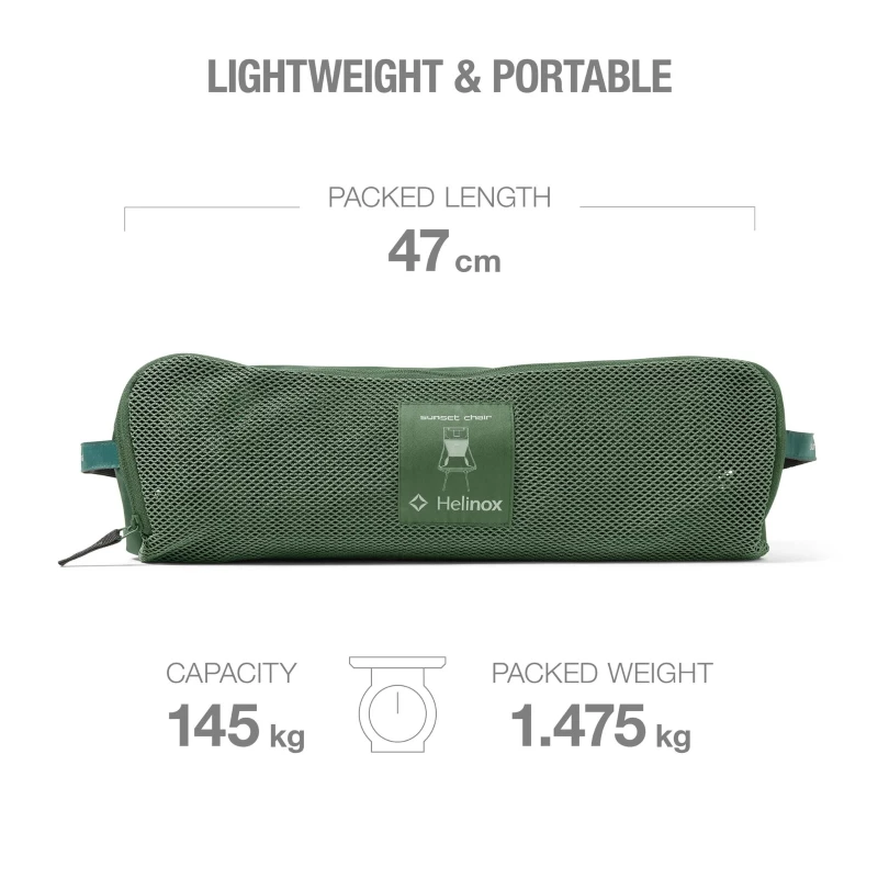 Of het nu gaat om kamperen, muziekfestivals, chillen in het park of op een dakterras in de stad, de Sunset is ontworpen met een minimalistische benadering voor maximaal comfort. De kern van het ontwerp is gebaseerd op de expertise van Helinox op het gebied van materialen, constructie, comfort en stijl. Voor een betere ondersteuning is hij ontworpen met een hogere rugleuning en een DAC aluminium frame met langere poten voor een hogere zithoogte. Het frame is sterk, lichtgewicht en steunt op een schokkoordsysteem dat de montage sneller en gemakkelijker maakt. Het geventileerde materiaal van 600D polyester zorgt voor ademende prestaties op warme dagen, en de gestroomlijnde draagtas kan worden omgevormd tot een kussen.