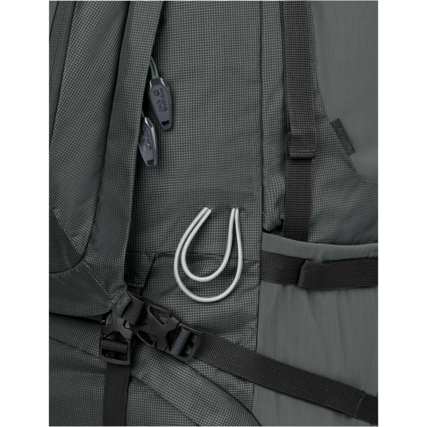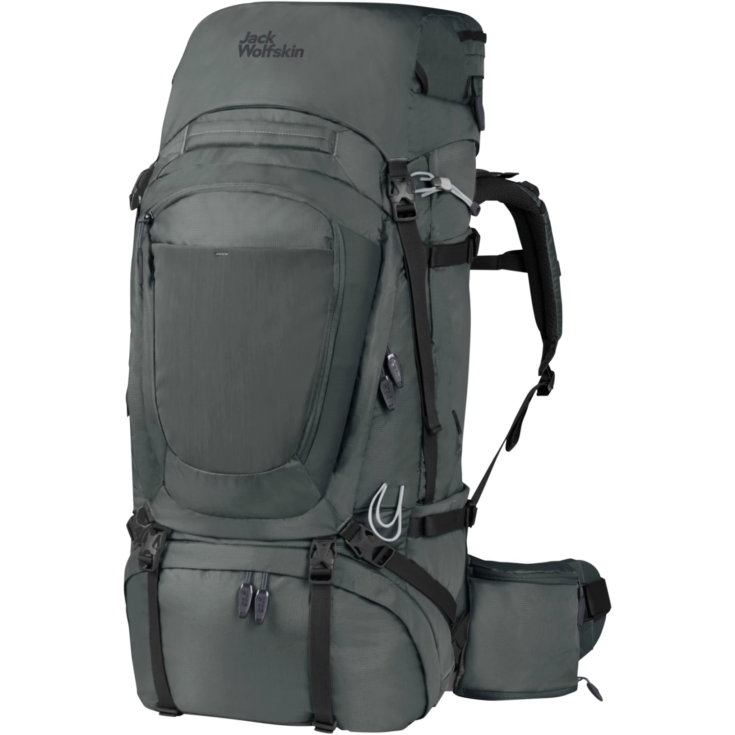 In de grote zijzakken passen gemakkelijk een waterfles en uw tentstokken. Bovendien is aan de heupgordel een 2-in-1 zak bevestigd, die met een bevestigingselastiek kan worden omgevormd van een klein zakje voor een mueslireep tot een flessenhouder.