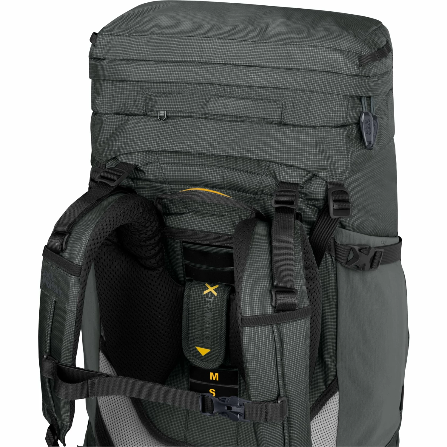 Om ervoor te zorgen dat u het gewicht zonder problemen lang op uw rug kunt dragen, maakt het draagsysteem X-TRANSITION gebruik van een dikke rugbekleding en een stevig aluminium frame. U kunt de ruglengte aanpassen aan uw individuele behoeften – evenals het volume – dankzij de compressiebanden aan de zijkanten, aan de onderkant en onder de toegang aan de voorkant.