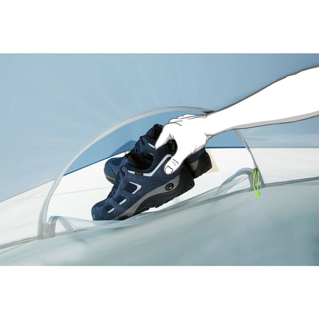 De buitentent is gecoat met PU aan de binnenkant en siliconen aan de buitenkant. Dit maakt het niet alleen zeer scheur- en trekvast, maar ook op lange termijn waterdicht. De EXOLIGHT heeft een ingang die ook als ventilatie dient. Het toegangsluik kan aan beide zijden aan de palen worden bevestigd, zodat het open blijft. Dit kan snel en gemakkelijk gebeuren met extra clips. De binnentent bestaat volledig uit muskietengaas.