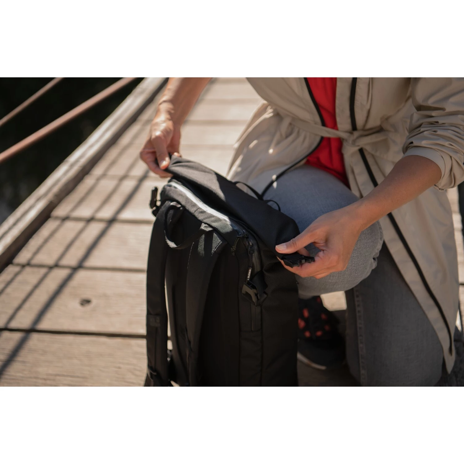 De supergrote zak met rits is de perfecte plaats voor uw treinkaartje, paspoort en alles wat u onderweg bij de hand wilt hebben. U kunt ook een LED-lampje aan de rugzak bevestigen.