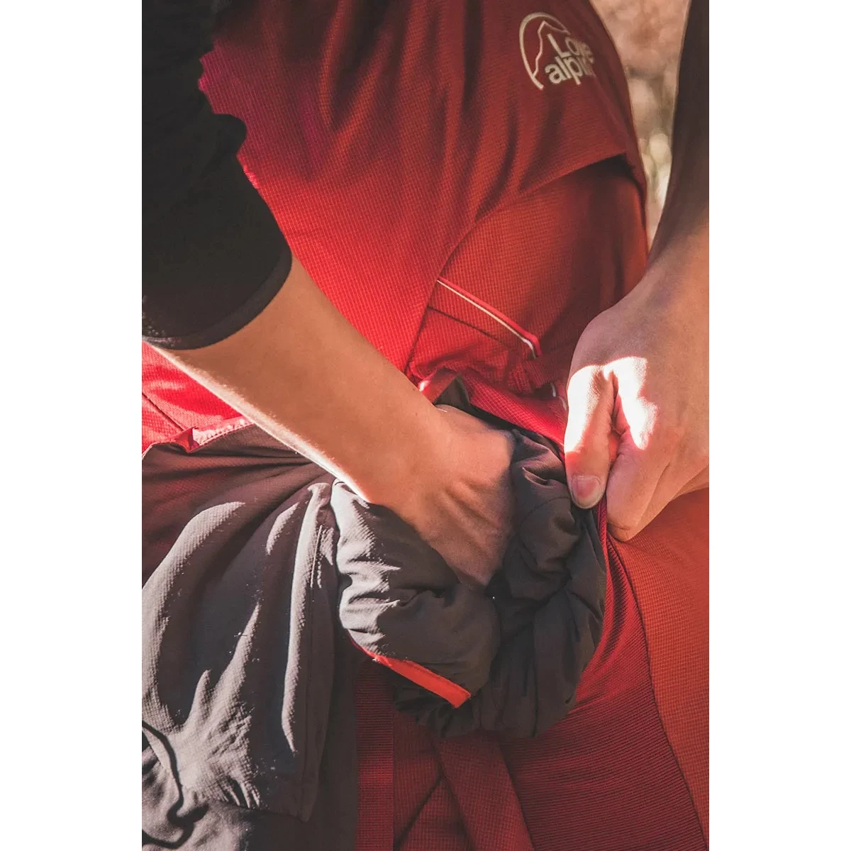 - Geweven compressielus om trekkingstokken en ijsbijl veilig te bevestigen