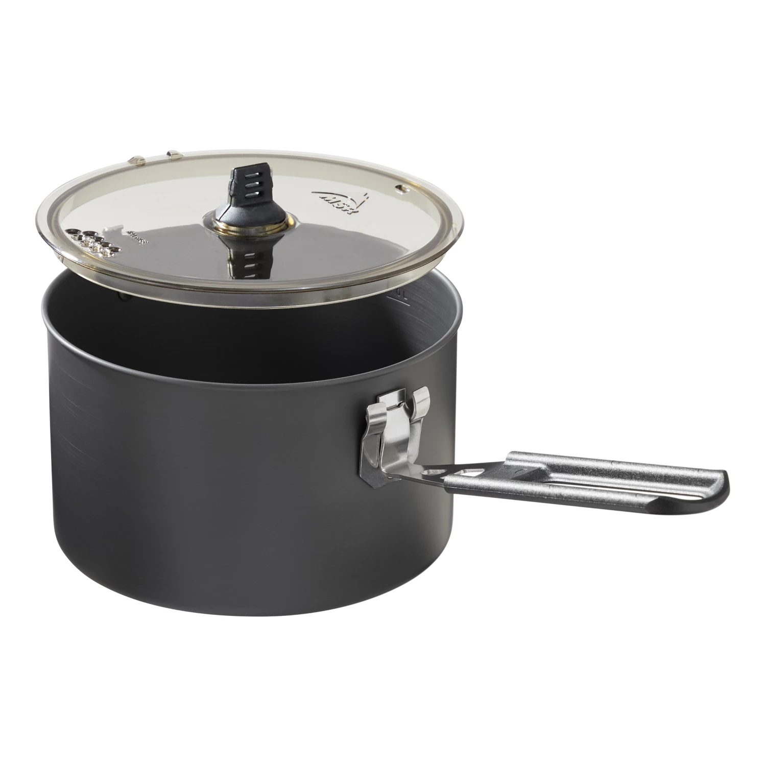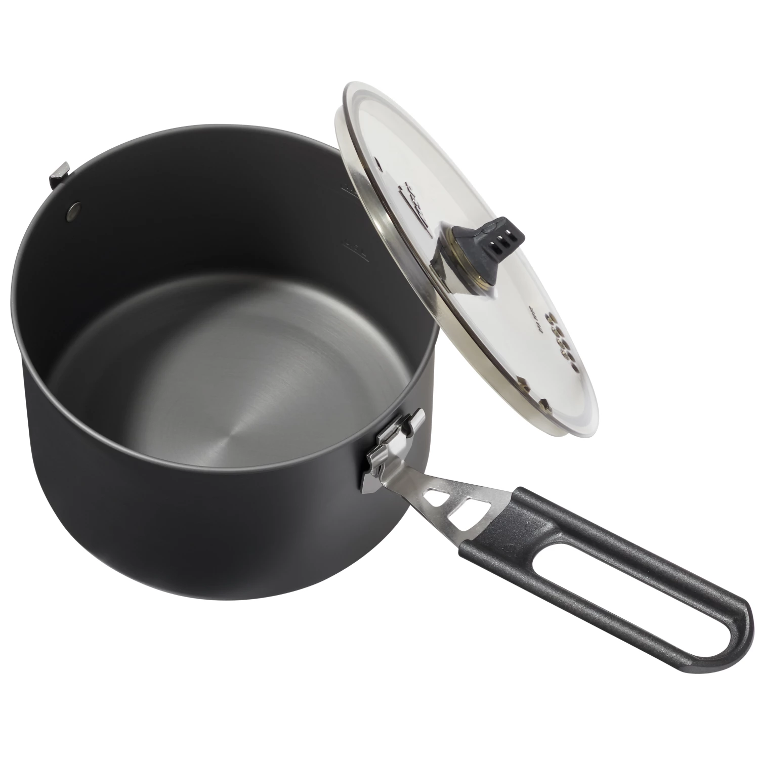 De voor backpackers is bijzonder licht en robuust dankzij de hoogwaardige constructie van hard geanodiseerd aluminium, waardoor het een solide basisuitrusting is voor solotochten. Deze pan heeft de gelijkmatige warmteverdeling en krasbestendigheid van aluminium. Hij is ideaal voor het koken van water en eenvoudige maaltijden tijdens solotochten of als aanvulling op andere outdoorkoks. De compacte vorm en het inklapbare handvat maken hem extra ruimtebesparend zodat je ver en snel kunt komen.