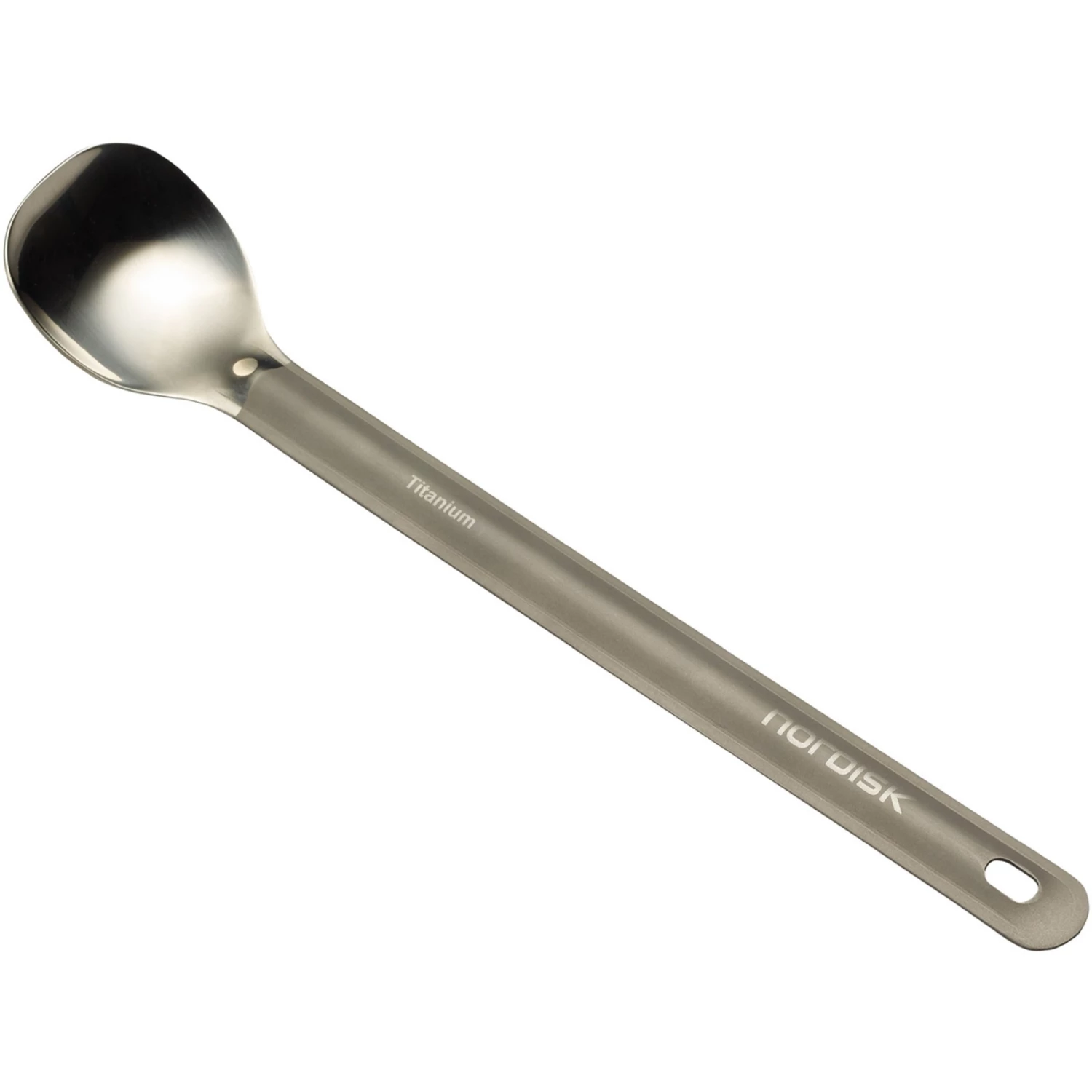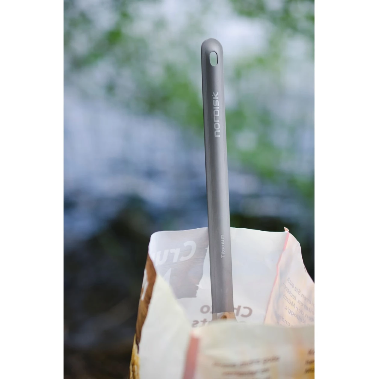 De biedt de mogelijkheid om slechts één stuk bestek mee te nemen en de vork, lepel en bord thuis te laten – optimaal voor de extreme gewichtsbespaarder. Het grote voordeel is het extra lange handvat, waarmee je met 22 cm rechtstreeks uit de zak kunt eten, dus ideaal voor het eten van droogvoer. Het titanium geeft de constructie stabiliteit en sterkte en weegt toch bijna niets. De XL-lepel heeft een klein gat voor een karabijnhaak en is voorzien van een gepolijst eetoppervlak en een gefreesd handvat voor een betere grip. Het gedrukte Nordisk opschrift voegt een discrete elegantie toe aan het ontwerp.