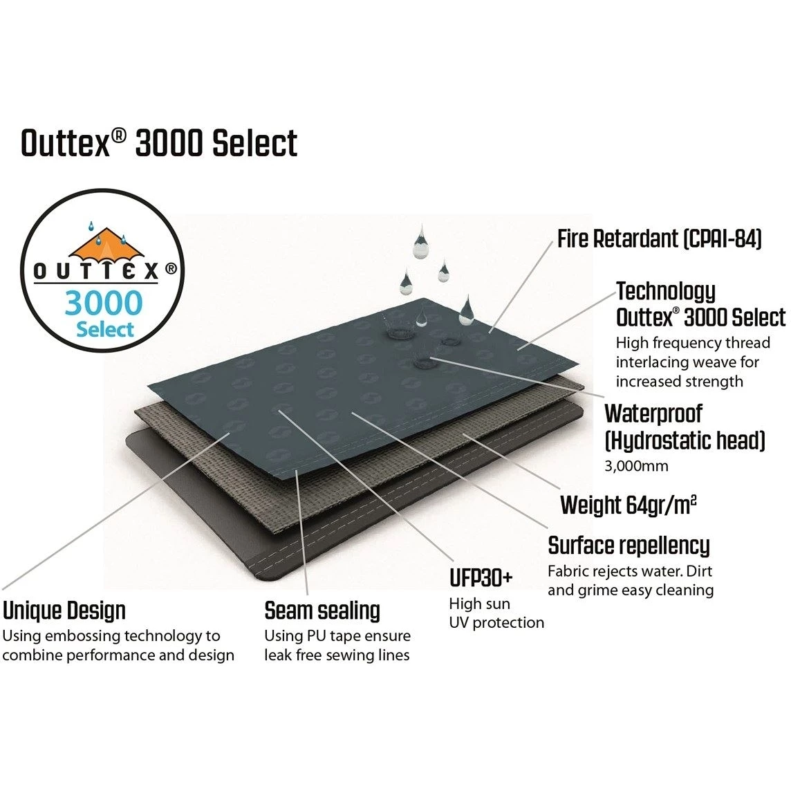 Outtex® 3000 Select is een slijtvaste, hoogwaardige stof van zuiver polyester met alle essentiële kenmerken die kampeerders verwachten voor het dagelijkse kamperen. Het is vlamvertragend en heeft een PU-coating die zorgt voor een waterdichtheid van 3.000 mm waterkolom.