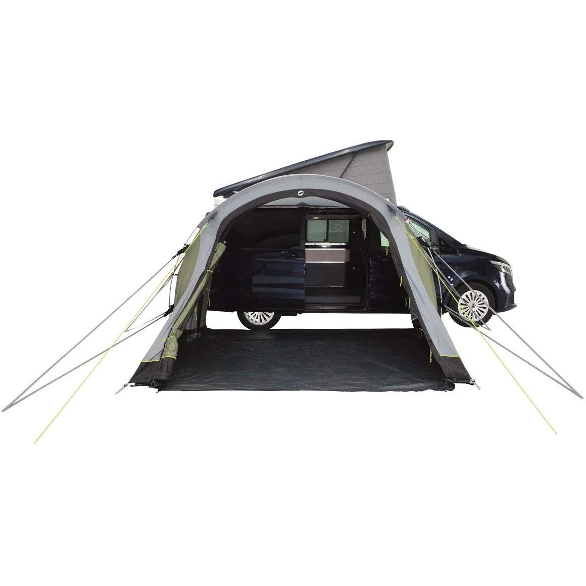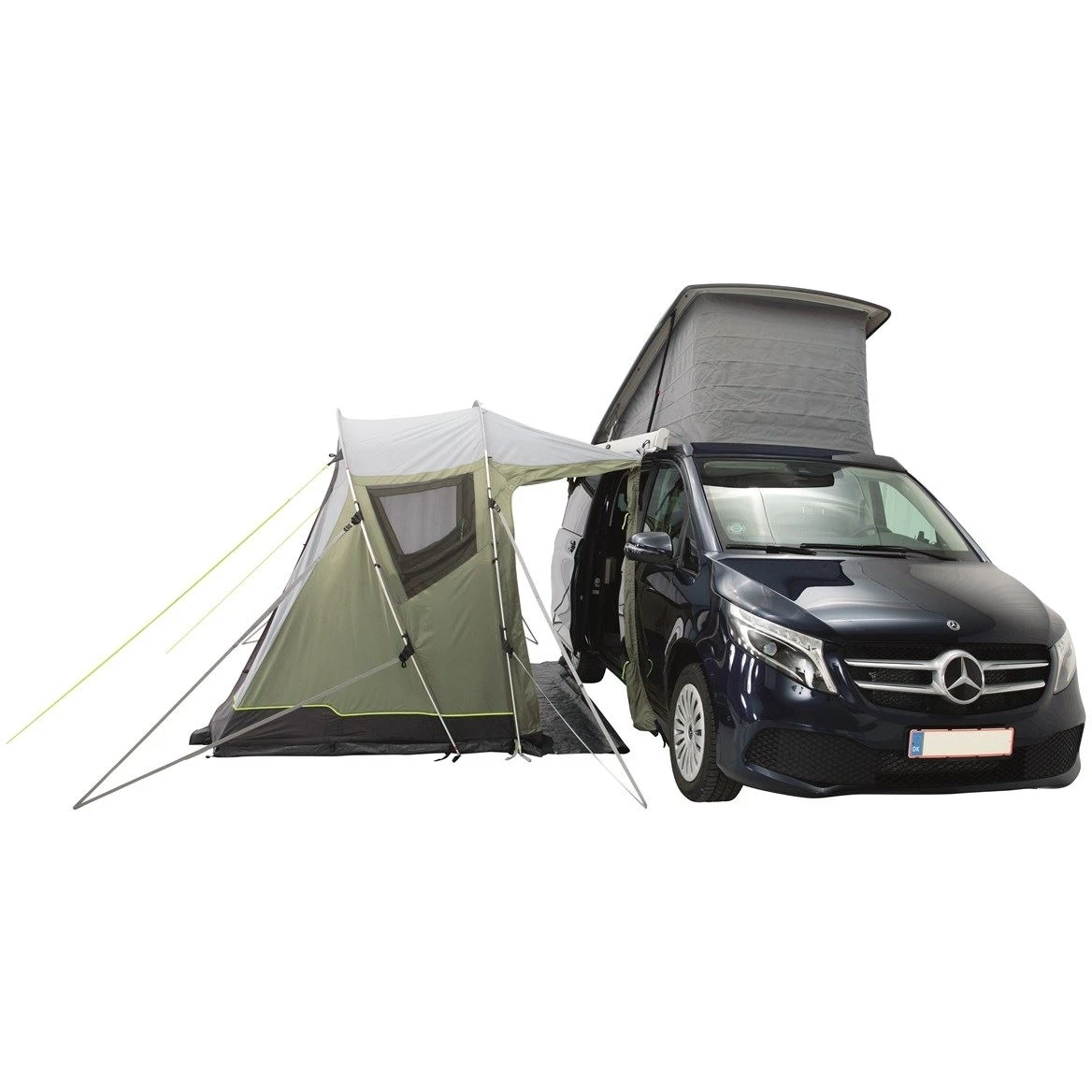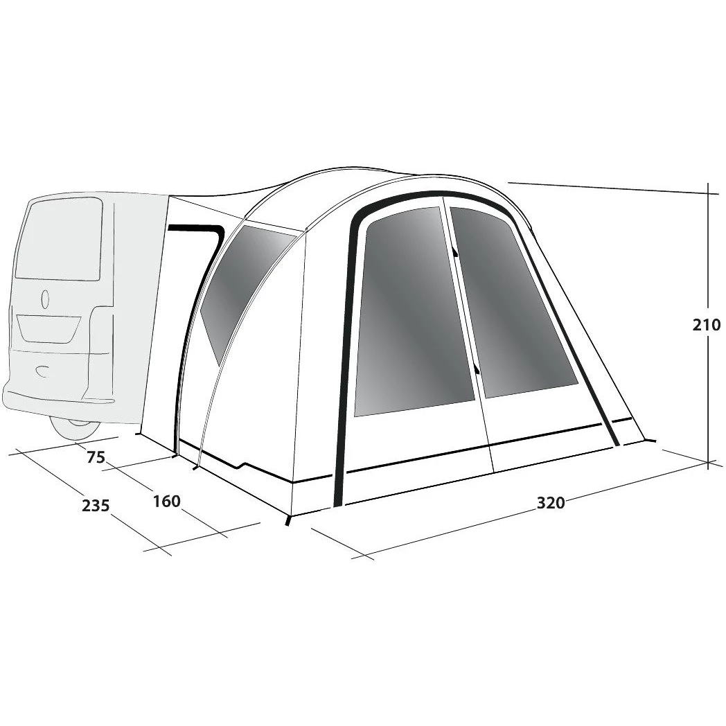 De Outwell Lakecrest vrijstaande busluifel is licht en compact. De voortent is gemakkelijk te ventileren en heeft twee zijruiten van gaas, een extra raam van gaas en een getint folieraam in de brede voordeur. Alle ramen kunnen worden afgesloten met een intern ritsgordijn. Dankzij de twee lichtgewicht aluminium paalbogen is hij gemakkelijk op te zetten. Als de voorwand volledig wordt opgerold en de verhoogde tentvloer wordt verwijderd, kan hij ook als ruime luifel worden gebruikt. In het luchtsluisgedeelte zijn er twee ingangen tegenover elkaar, waardoor het voertuig of de tent ook bij slecht weer goed toegankelijk is. Dankzij het meegeleverde grondzeil voor de luchtsluisruimte en de volledig te openen achterwand kan de binnenruimte worden vergroot en optimaal worden benut.