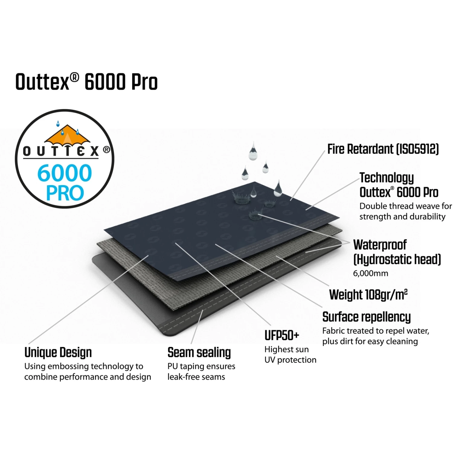 Outtex 6000 Pro is een hoogwaardige, uiterst sterke en duurzame stof van zuiver polyester, ontwikkeld voor onze luxere tentcollecties. Het is perfect voor kampeervakanties in elk seizoen, is vlamvertragend Het materiaal voldoet aan de nieuwste richtlijnen voor tentmaterialen.