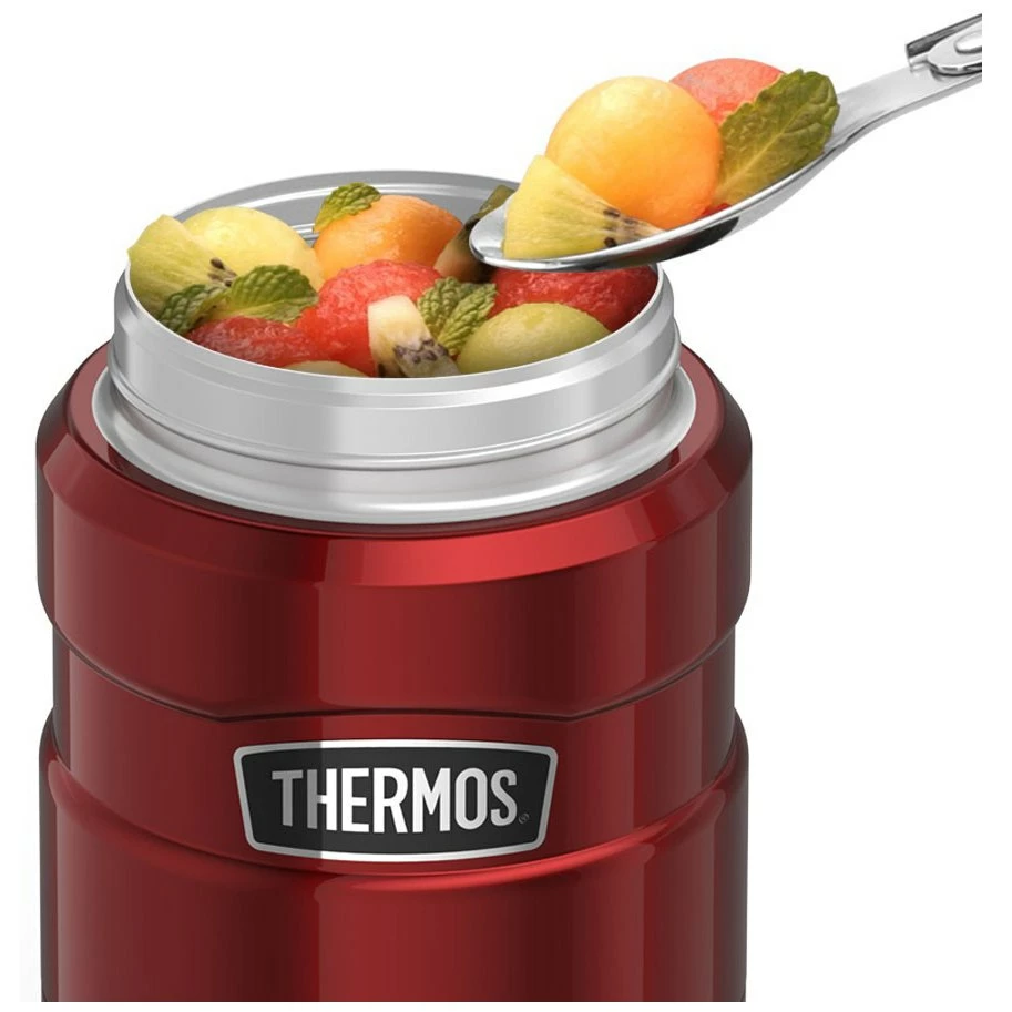 The provisions for the day – simply perfectly packaged: Despite its compact dimensions, Stainless King does not do things by halves when it comes to taste. What applies to freezing cold also applies to sweltering summer heat: the double-walled stainless steel with THERMOS® insulation technology stops the temperature exchange with the outside world. This means that hot drinks stay hot for 9 hours and cold drinks stay cold for a whole 14 hours. Stainless King is uncomplicated and reliable: Its large opening makes it easy to fill. The practical screw cap with integrated, folding stainless steel spoon ensures easy handling in all situations.