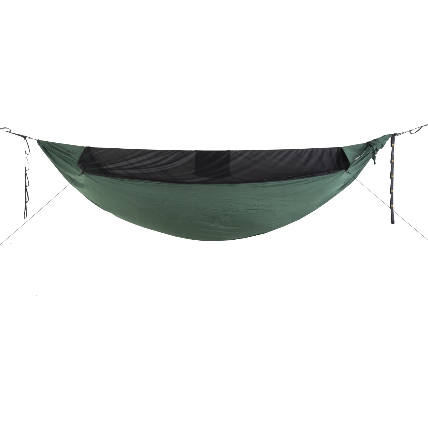 The is designed to be a user-friendly and always ready solution for outdoor sleeping with insect protection. Comfort and functionality are maximized and weight is minimized. The Ticket To The Moon Pro Hammock – Hammock sets up in less than a minute and the extended material length of 310cm (325cm from carabiner to carabiner) gives more room for comfortable sleeping.