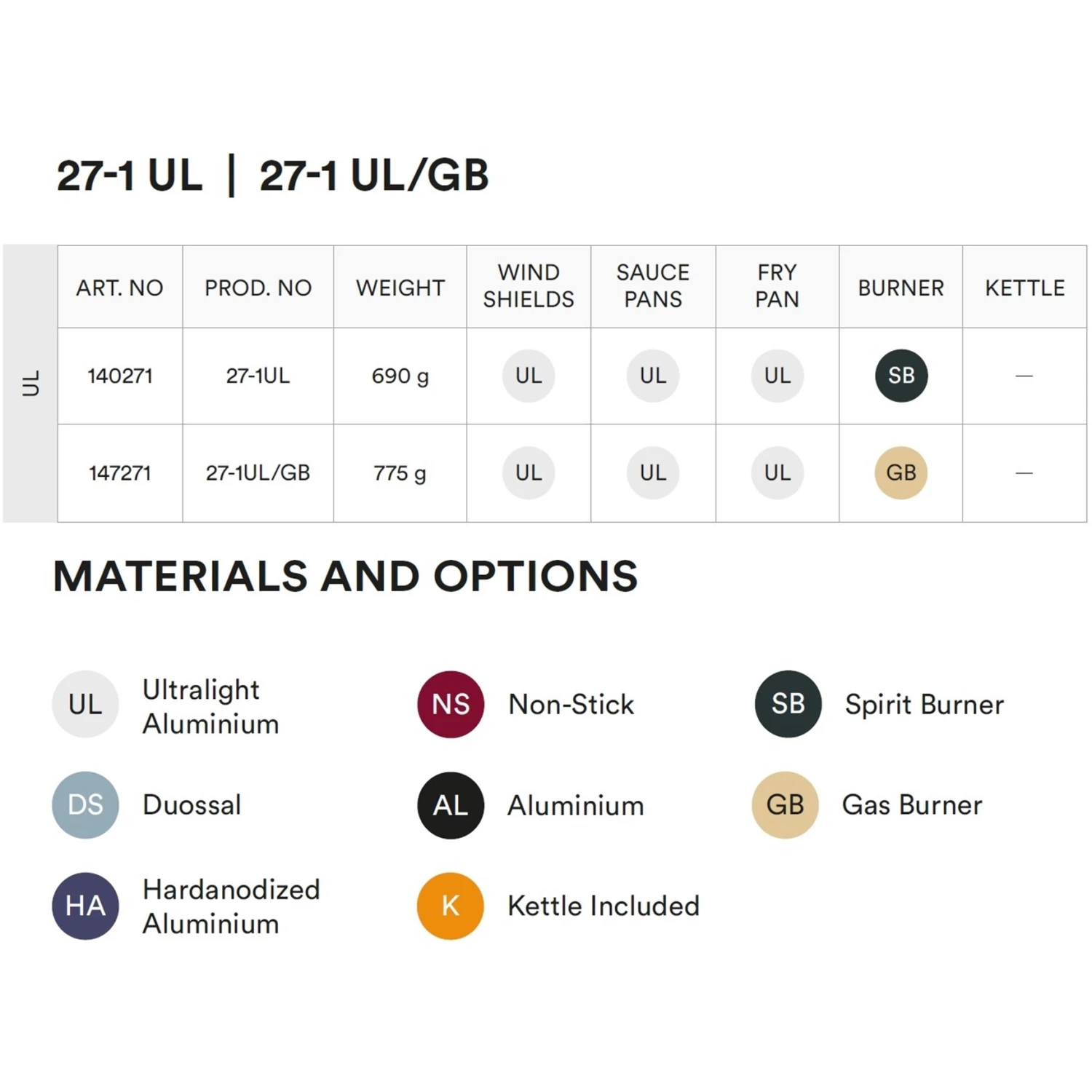 De 27-serie omvat kooktoestellen voor solowandelaars of twee personen met kleiner kookgerei. Deze compacte kookset vraagt minimale ruimte in de rugzak. Met de beugels in het bovenste windscherm opgeklapt kan het fornuis worden gebruikt met grotere potten uit het Trangia-assortiment.