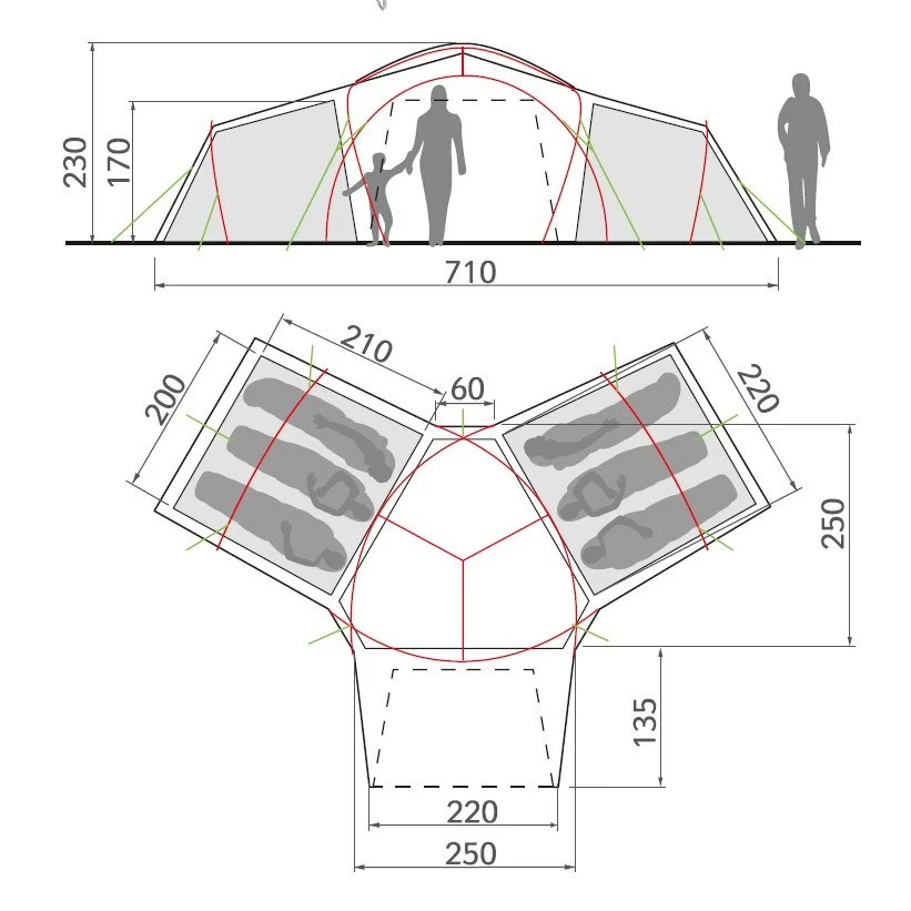 Hier is extravagant design gecombineerd met maximale functionaliteit: ideaal voor iedereen die het beu is om altijd “achteraan” te moeten slapen in kruisslaaptenten. Door de binnententen te draaien worden de slaapplaatsen “lengteslapers”. Met een waterkolom van 3.000 mm is de tent ook bij voortdurende regen betrouwbaar waterdicht en biedt hij een zeer goed binnenklimaat.