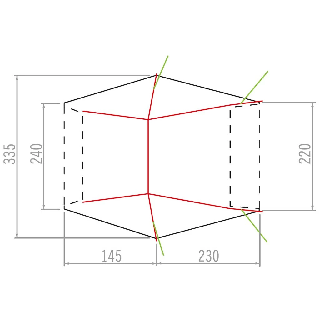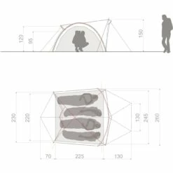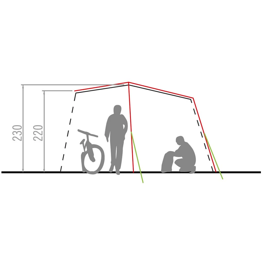 Ruime tentconstructie voor gezinnen en groepen. Geoptimaliseerd ruimteconcept: koepelconstructie voor veel ruimte in het voorportaal en gewichtsbesparende tunnelconstructie in de aangrenzende slaapcabines.
