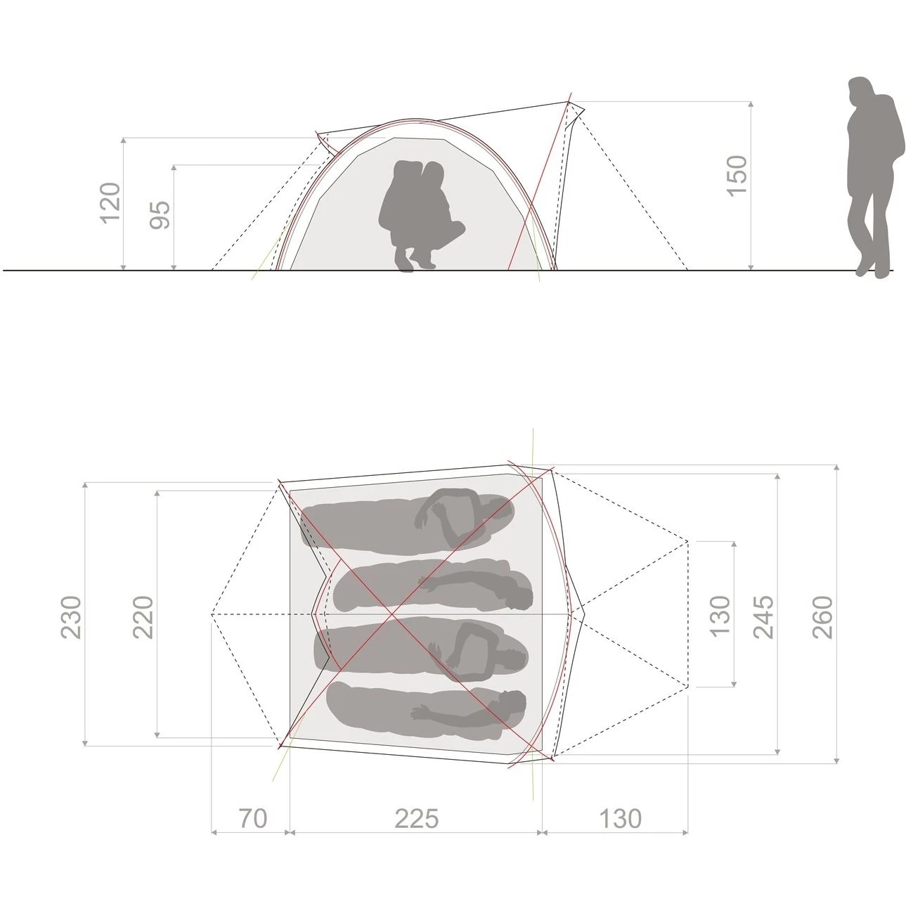 De is een grote, ruime koepeltent voor trekkers, backpackers en jonge gezinnen. Hij is snel op te zetten, zeer ruim en heeft een grote luifel.