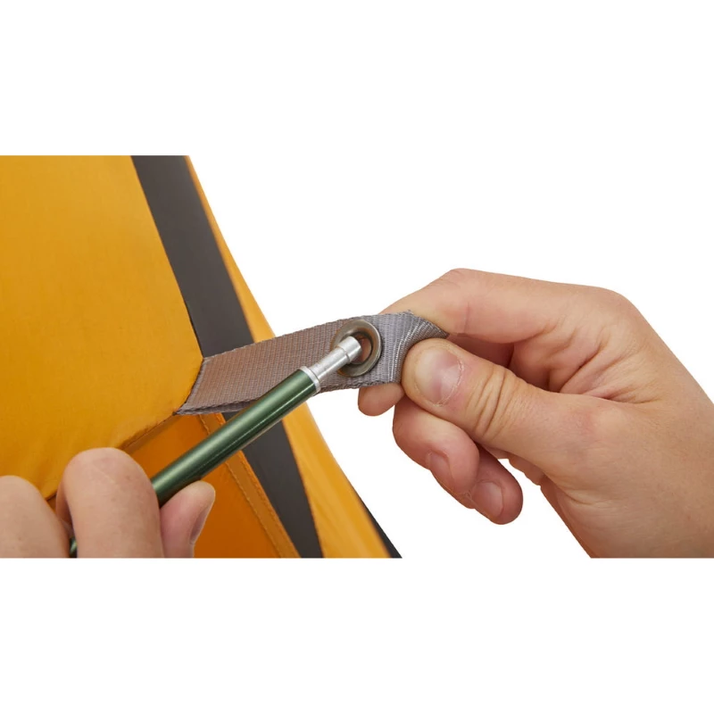 Alle bevestigingspunten van de buitentent zijn versterkt met Power Triangles. Vooral bij het sterke, minder flexibele polyesterdoek met extra PU-coating is het handig als de spanningspunten zijn versterkt. Hierdoor wordt de kracht niet selectief uitgeoefend, maar over een groter oppervlak verdeeld.