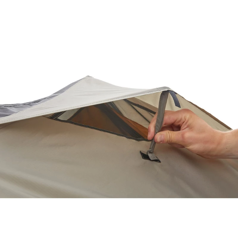 De verbinding tussen de binnen- en buitentent heeft een praktische en duurzame oplossing. Het rubber kan strakker worden geknoopt of indien nodig eenvoudig worden vervangen.